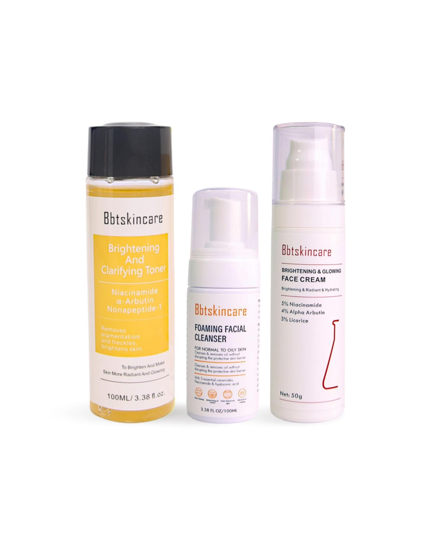 Includes: Foaming Facial Cleanser, Brightening & Clarifying Toner, Brightening & Glowing Face Cream
